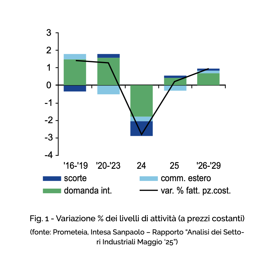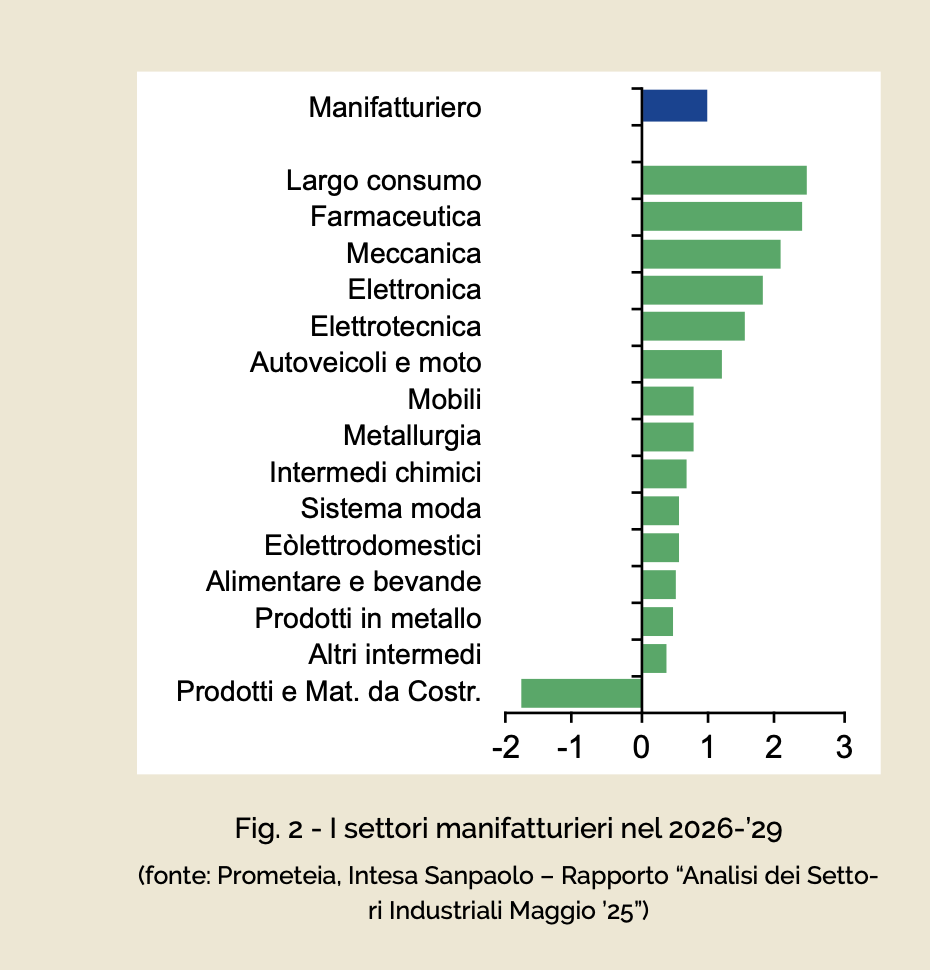 Anche il mercato nazionale offrirà un sostegno alla crescita del 2025, sia attraverso i consumi (favoriti da un aumento del potere d’acquisto delle famiglie e dai rinnovi dei contratti di lavoro), sia tramite un rinnovato slancio degli investimenti. Nonostante un contesto ancora complesso, gli incentivi legati al programma Transizione 5.0 e la buona redditività delle imprese stimoleranno l’acquisto di macchinari e attrezzature, interrompendo la fase di stagnazione vista nel 2024 e bilanciando in parte il rallentamento del comparto edile. Nel periodo 2026-2029, si prevede una crescita media annua dell’industria manifatturiera intorno all’1%, con una maggiore vivacità attesa nei prossimi due anni grazie al contributo degli investimenti sostenuti dal PNRR.