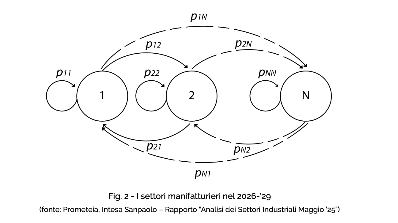 dall’omonimo matematico russo, è utilizzato in numerose applicazioni, per rappresentare un processo stocastico costituito da una se- quenza di variabili casuali, che rappresenta- no l’evoluzione di un sistema (nel nostro caso l’avanzamento quali/quantitatativo della idea progettuale innovativa, portata avanti da un’azienda del settore conciario e della Pelle). Gli eventi sono “concatenati” o “collegati” in serie tra loro attraverso transizioni di tipo “memoryless” (in forza delle quali la storia che ha portato a raggiungere lo stato (i-1), precedente quello “attuale” – che definiamo “i-esimo”-, non conta; ai fini della determinazione di un qualsiasi stato i-esimo del sistema, occorre quindi conoscerne esclusiva- mente lo stato che precede l’ultima transizione, tralasciando l’intera storia effettivamente verificatasi). Obiettivo analitico della metodologia delle catene di Markov, applicata ad un sistema di stati con transizioni tra di essi, consiste nel fornire la probabilità di trovarsi in un particolare stato (l’avanzamento dell’idea progettuale dell’azienda di settore) in un particolare istante (nel periodo di tempo disponibile per lo sviluppo progettuale dell’innovazione aziendale).