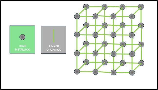 I Metal–Organic Frameworks (MOF) costituiscono una classe innovativa di materiali porosi ibridi, ottenuti dalla coordinazione di ioni metallici o cluster metallici con leganti organici funzionalizzati (Figura 1 e 2), che si auto-organizzano in strutture cristalline tridimensionali caratterizzate da elevatissima area superficiale e porosità modulabile[1,2]. Un esempio classico dei MOF è MOF-5 (Zn4O(1,4-benzodicarboxylate)3), di cui pochi grammi hanno una area superficiale grande quanto un campo da calcio.