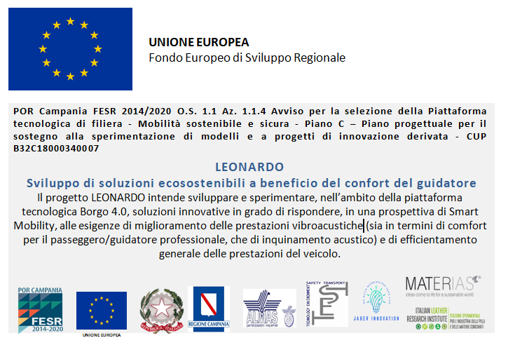 “LEONARDO (sviLuppo di soluzioni EcOsosteNibili A beneficio del confoRt del guiDatOre): sviluppo di tecnologie innovative di rifinizione di pelli destinate all’industria dell’Automotive, finalizzate al miglioramento di particolari caratteristiche (vibroacustiche, resistenza all’usura ed alla luce) correlate al confort percepito dagli utilizzatori finali.