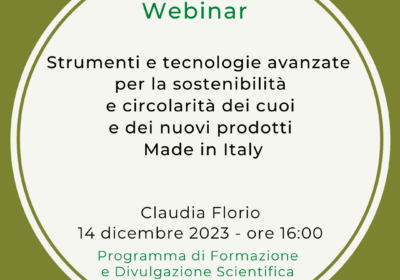 Webinar 14.12.2023 – “Strumenti e tecnologie avanzate per la sostenibilità e circolarità dei cuoi e dei nuovi prodotti Made in Italy”